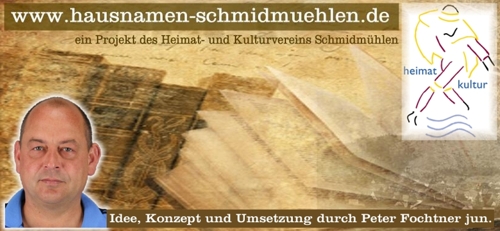 | Ein Projekt von Peter Fochtner jun. im Auftrag des Heimat- und Kulturvereins Schmidmühlen | webmaster@hausnamen-schmidmuehlen.de |